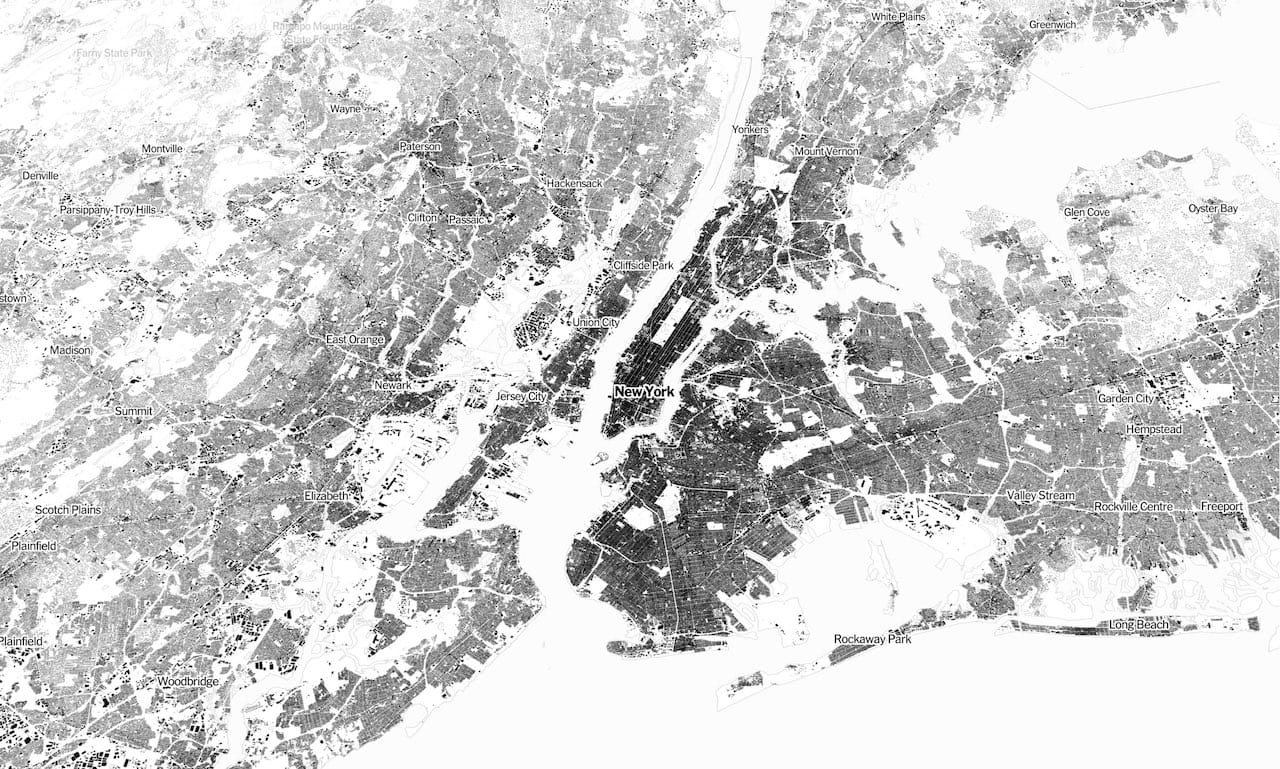 建物を黒く表現したアメリカの地図が人間活動のスケールを浮き彫りにする